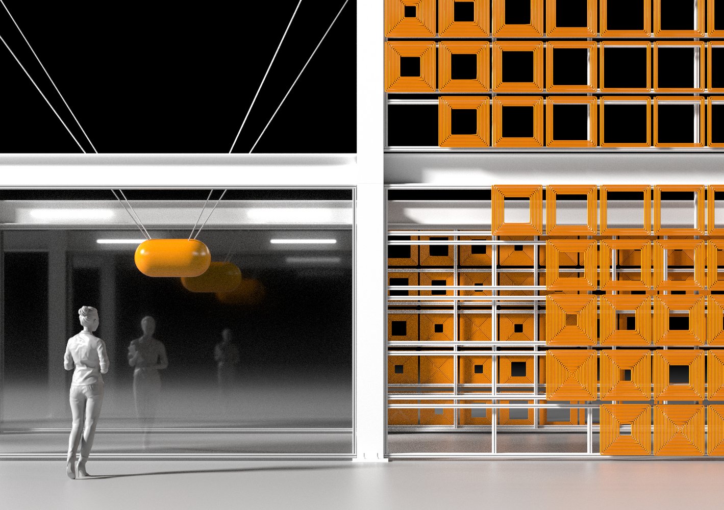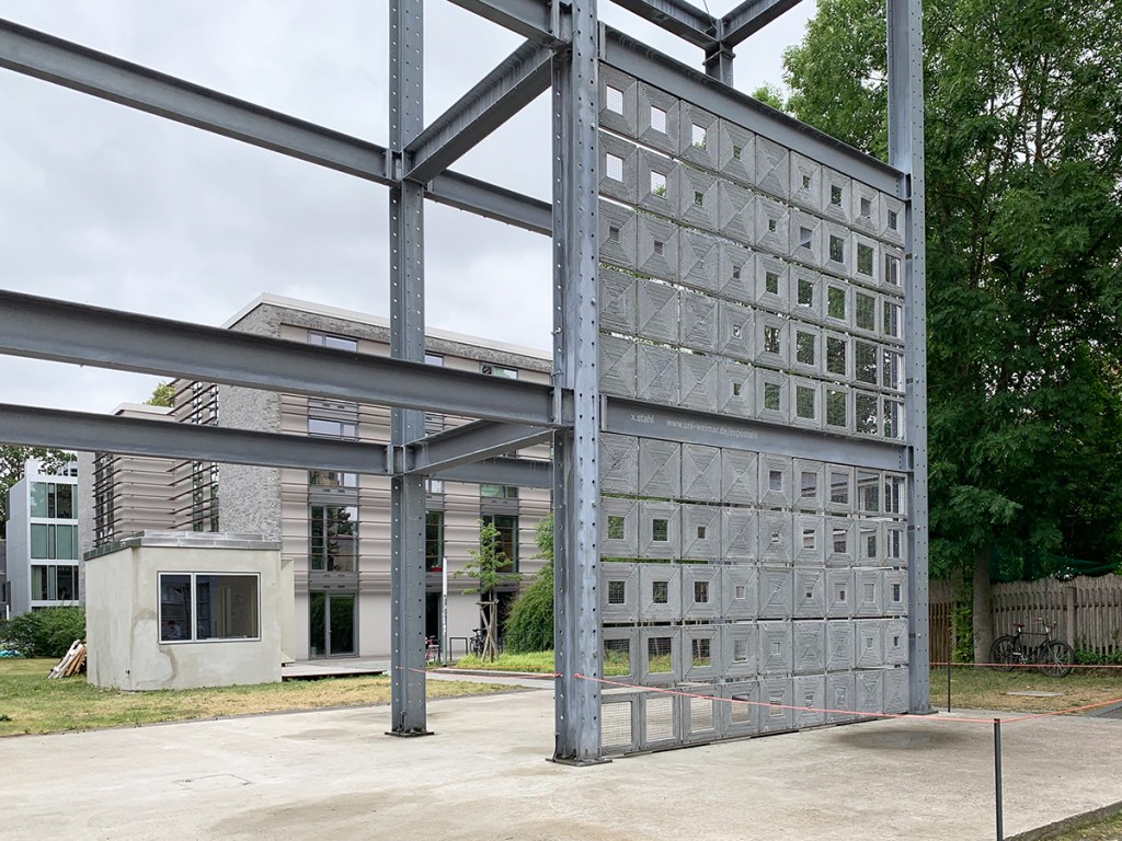 바우하우스 사례에서는 파라메트릭한 접근을 통해 설계자가 의도한대로 부분적인 개방성을 만들어 줍니다. 마치 퀼팅을 하듯 사각형 모듈을 채운 모습이 참 인상적입니다. 개별 패널들은 재료의 수축을 안정화하기 위해 카본 파이버 매쉬를 깔아놓고 그 위에 출력되었습니다. 이후 파사드 패널을 타공하여 철골조에 배치된 알루미늄 프레임에 조립연결된 모습을 보실 수 있습니다. 물론 이 연구에서는 1개의 출력 레이어만을 이용하였지만, 레어의 수를 증가시키면 더 다채로운 입면을 만들 수 있을 것이라고 생각합니다. 이 사례는 3D 프린팅 프로세스가 당연히 커스터마이징을 가능하게 하며 작업효율적이고, 폐기물을 발생시키지 않는다고 합니다.