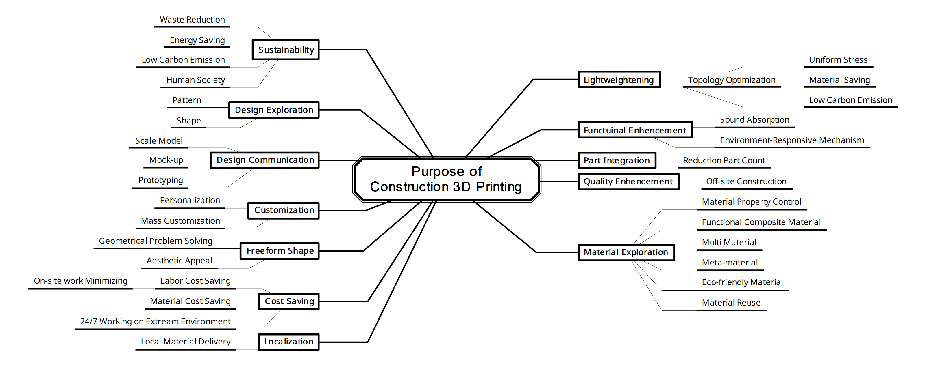 전 세계의 사람들은 왜 3D 프린팅(적층제조) 기술을 건설에 접목하고 있을까요? 현대의 건설3D프린팅 기술은 해당 프로젝트의 고유한 특성에 따라 다양한 목적으로 활용되고 있습니다. 가장 높은 빈도의 활용 목적은 자유형상(Freeform) 구현, 맞춤화(Customization), 디자인 커뮤니케이션(Design Communication), 지속가능성(Sustainability) 확보가 대표적입니다. 보다 비즈니스 관점에서 세부적으로 내려가면 원가절감(Cost Saving), 경량화(Lightweightening), 파트통합(Part Integration), 품질향상(Quality Enhencement)가 있습니다. 연구적/학술적 관점에서는 디자인탐구(Design Exploration), 재료탐구(Material Exploration), 기능향상(Function Enhencement) 또는 혁신 등으로 대표됩니다. 앞으로 적층제조 기술이 건설산업에 얼마나 더 많은 활용 목적과 가치를 창출하게 될지, 그 귀추가 주목됩니다.