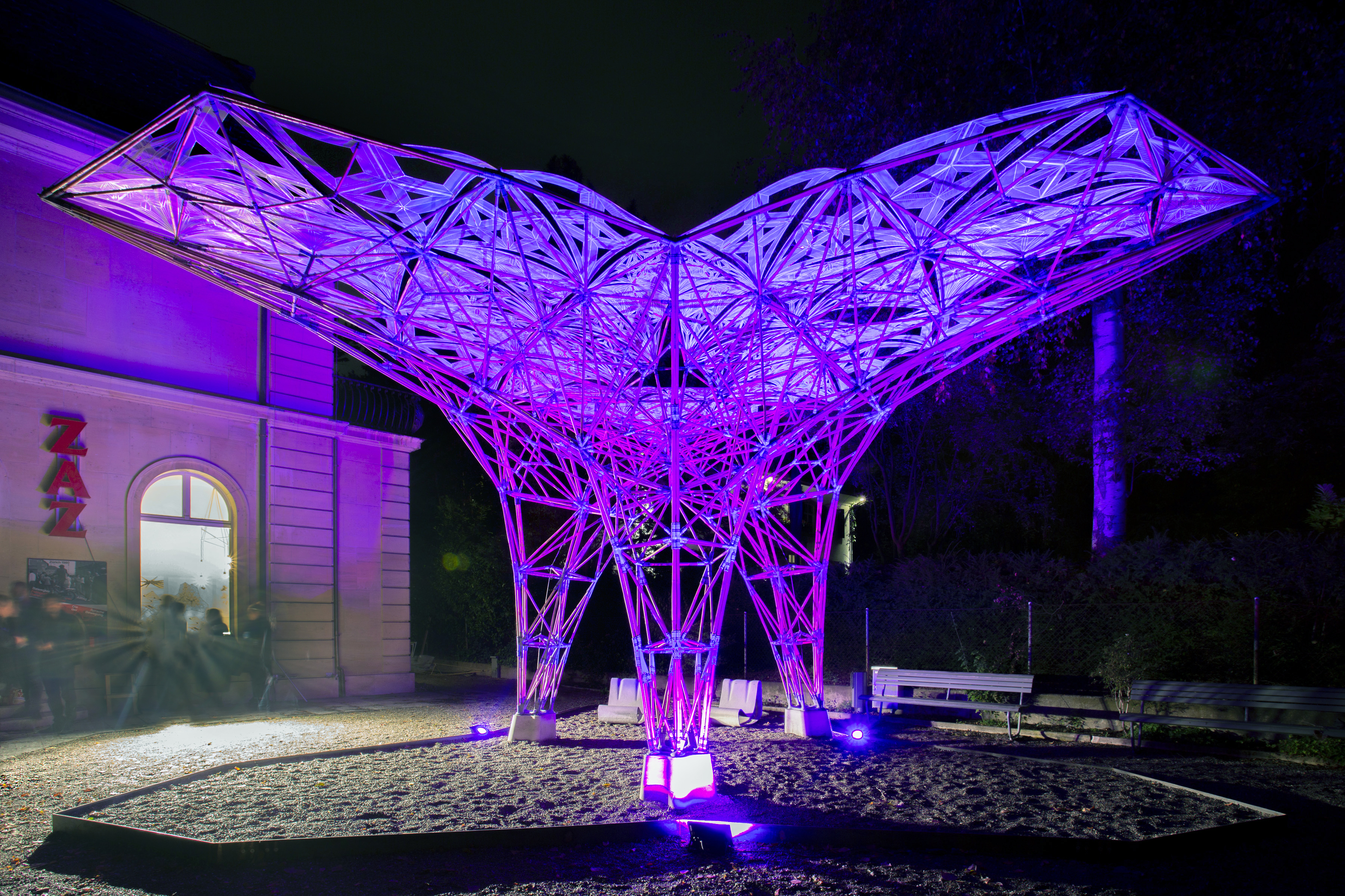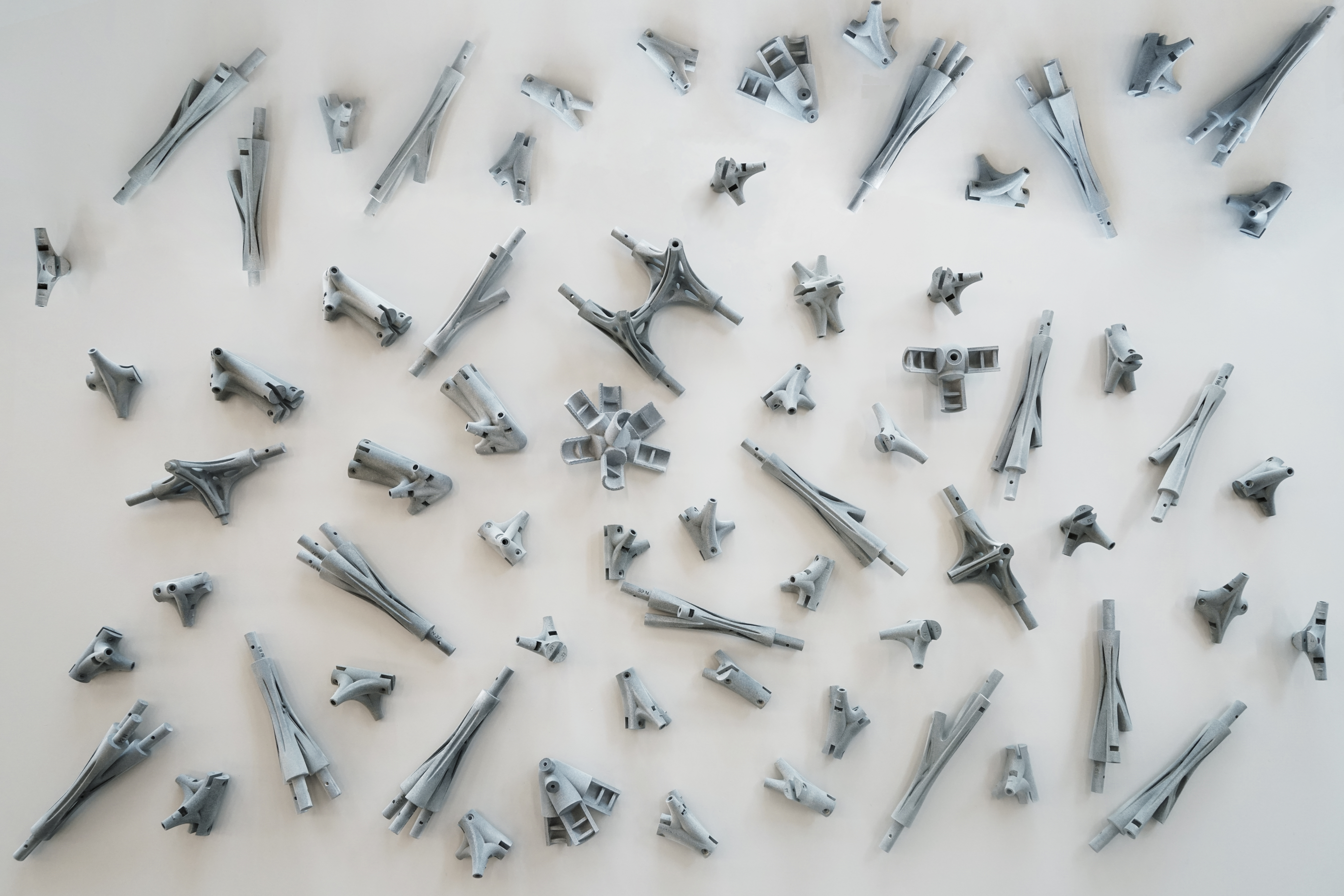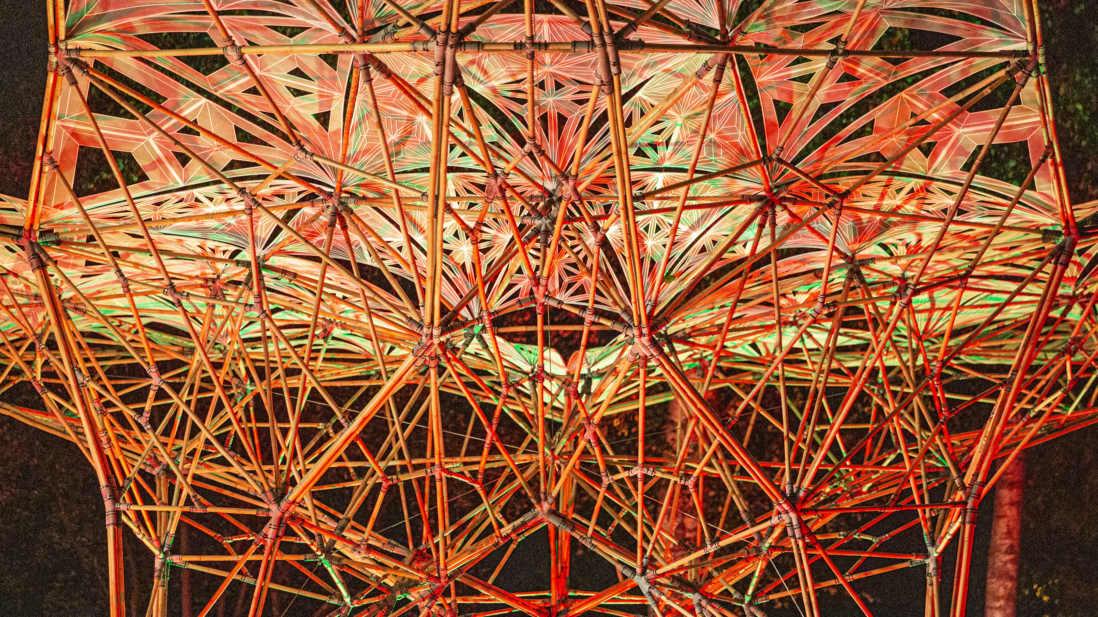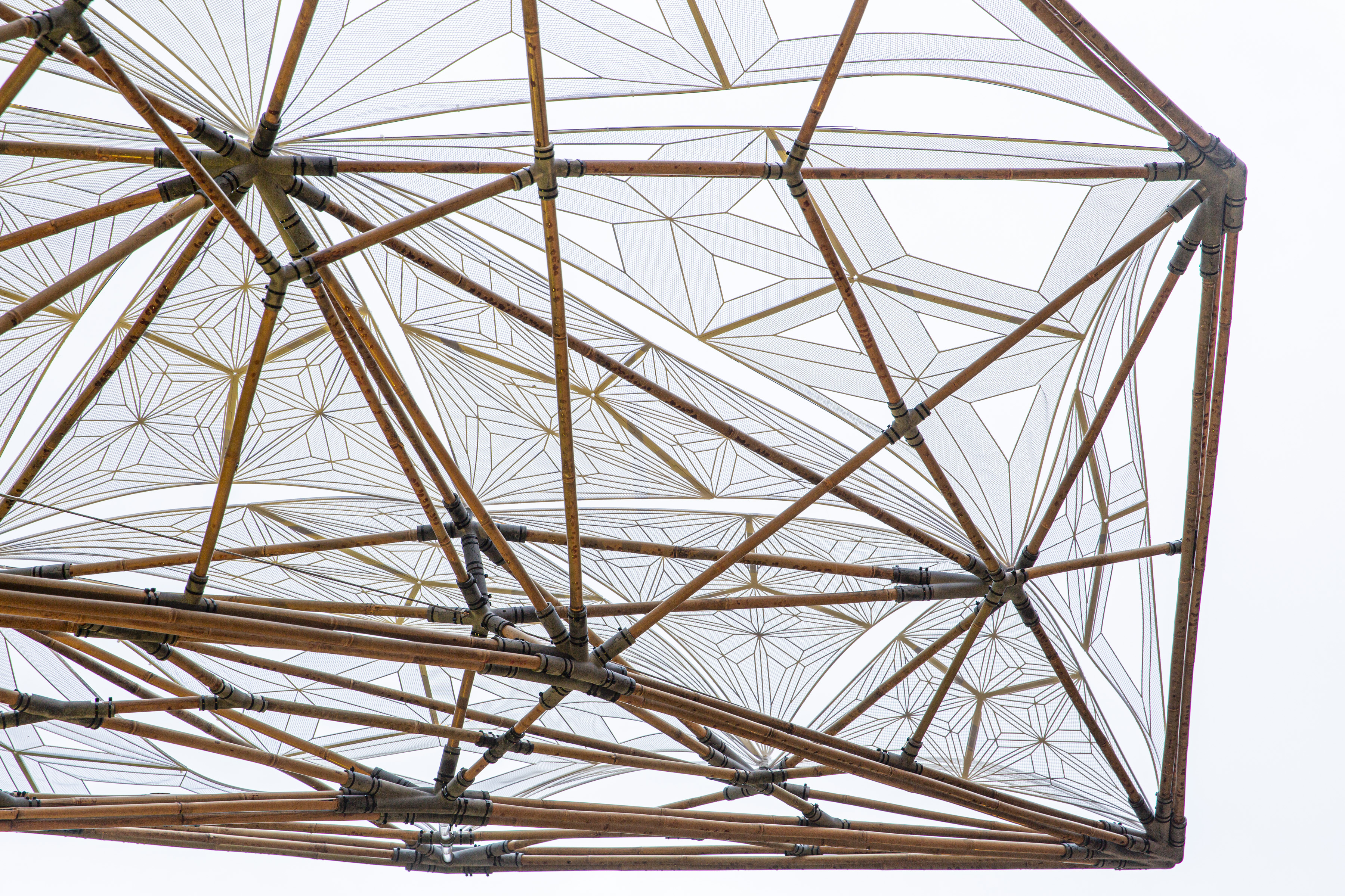 이 구조체는 총 380개의 PA-12 (HP, Multi Jet Fusion 3D 프린팅 기술) 조인트와, 1개의 SUS316L (EOS, Direct Metal Laser Sintering 3D 프린팅 기술) 조인트가 총 930개의 직경 20mm 대나무를 연결해주고 있습니다. 특히 중앙의 스테인리스 3D 프린팅 조인트는 5미터 길이의 세방향 캔틸레버를 포스트텐션(Post-tensioning) 기술로 강건하게 지지하고 있습니다. 요구되는 구조성능에 따라 최적의 3D 프린팅 방법(하이브리드 전략)과 소재를 사용함으로써 경제성과 구조적 합리성을 모두 갖추었습니다. 더하여, 세련된 라이크라 패브릭 패널은 표면에 UV 열가소성 소재의 3D 프린팅 처리를 통해 유연하면서도 강성을 갖추게 만들었습니다.